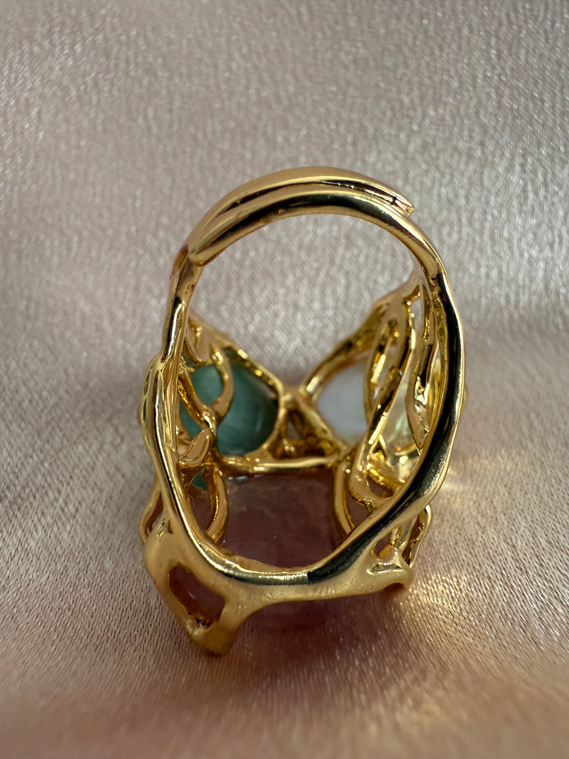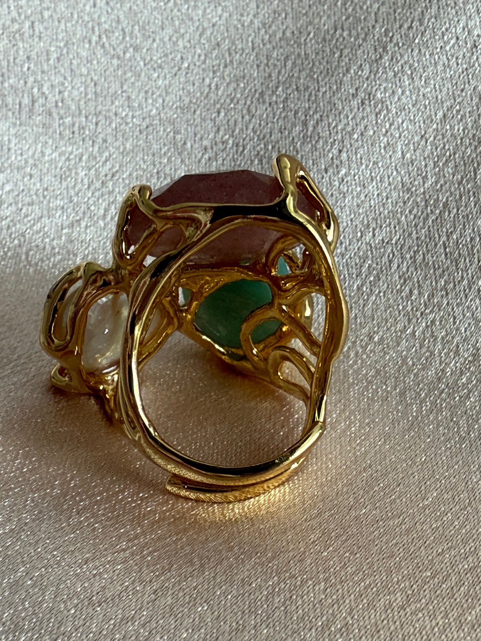 Magnifique bague majestueux de couleur vert/blanc/rose en acier inoxydable, ajustable.